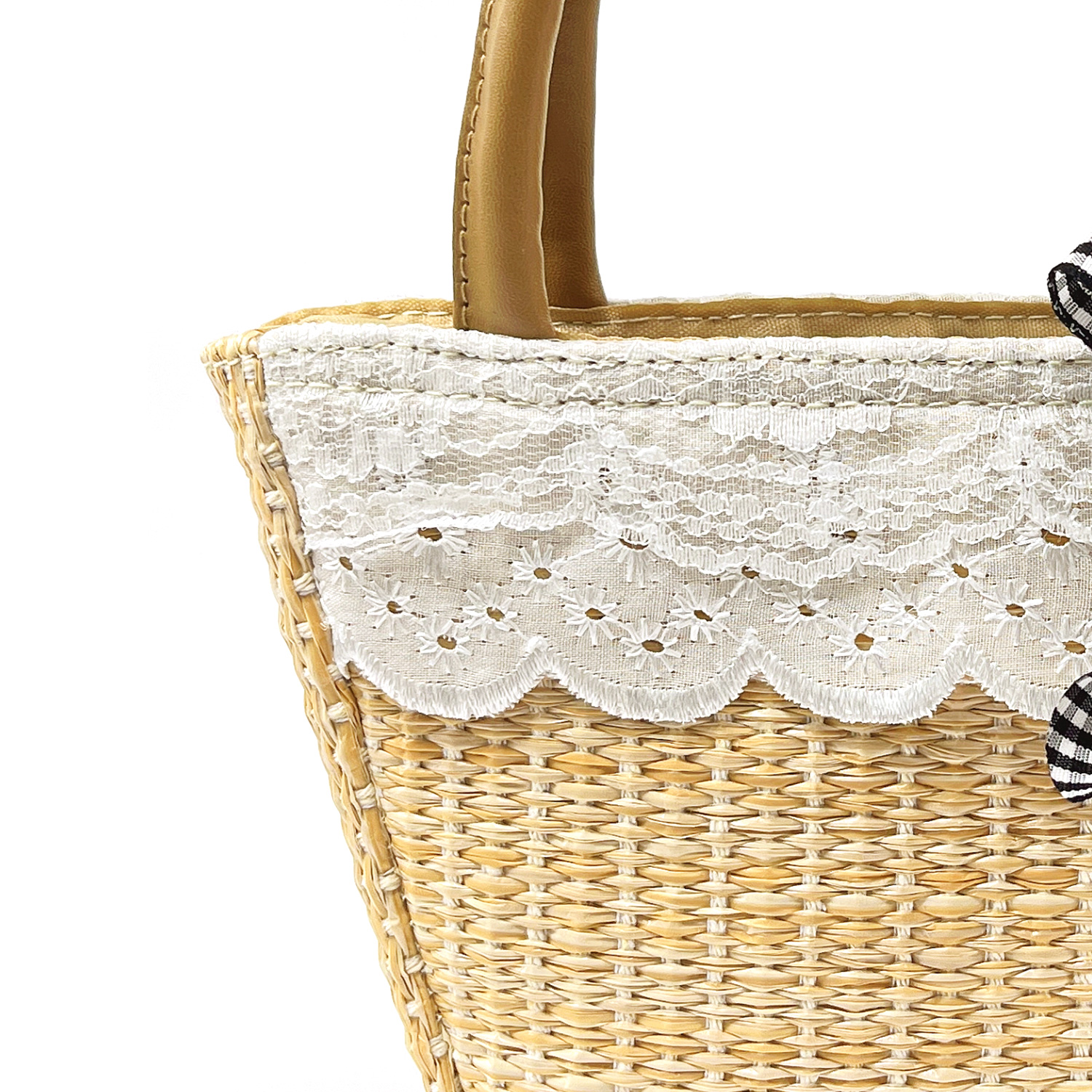 In terms of material, the main body is made of straw weaving technology, which is tightly woven and has clear texture, showing a natural and simple texture and conveying a strong pastoral atmosphere. The body of the bag is matched with white lace, lace delicate lace and hollow pattern, adding a sweet and elegant bag. The brown leather handle is strong and durable, complementing with straw and lace, and the overall color is harmonious and unified, with beige as the main tone, fresh and warm.