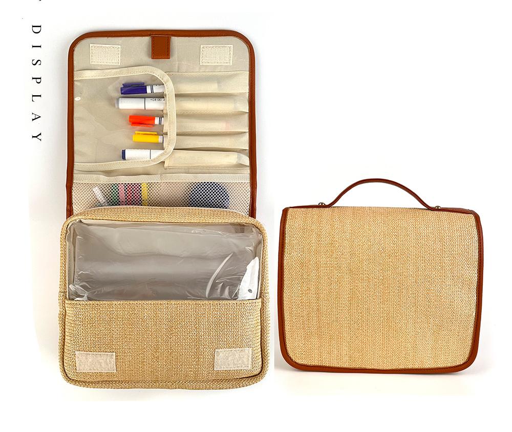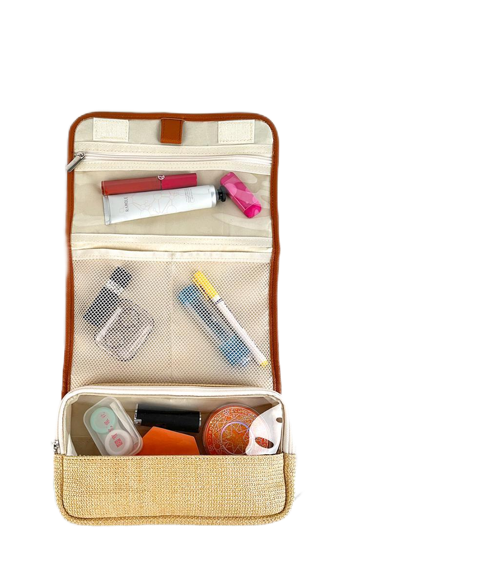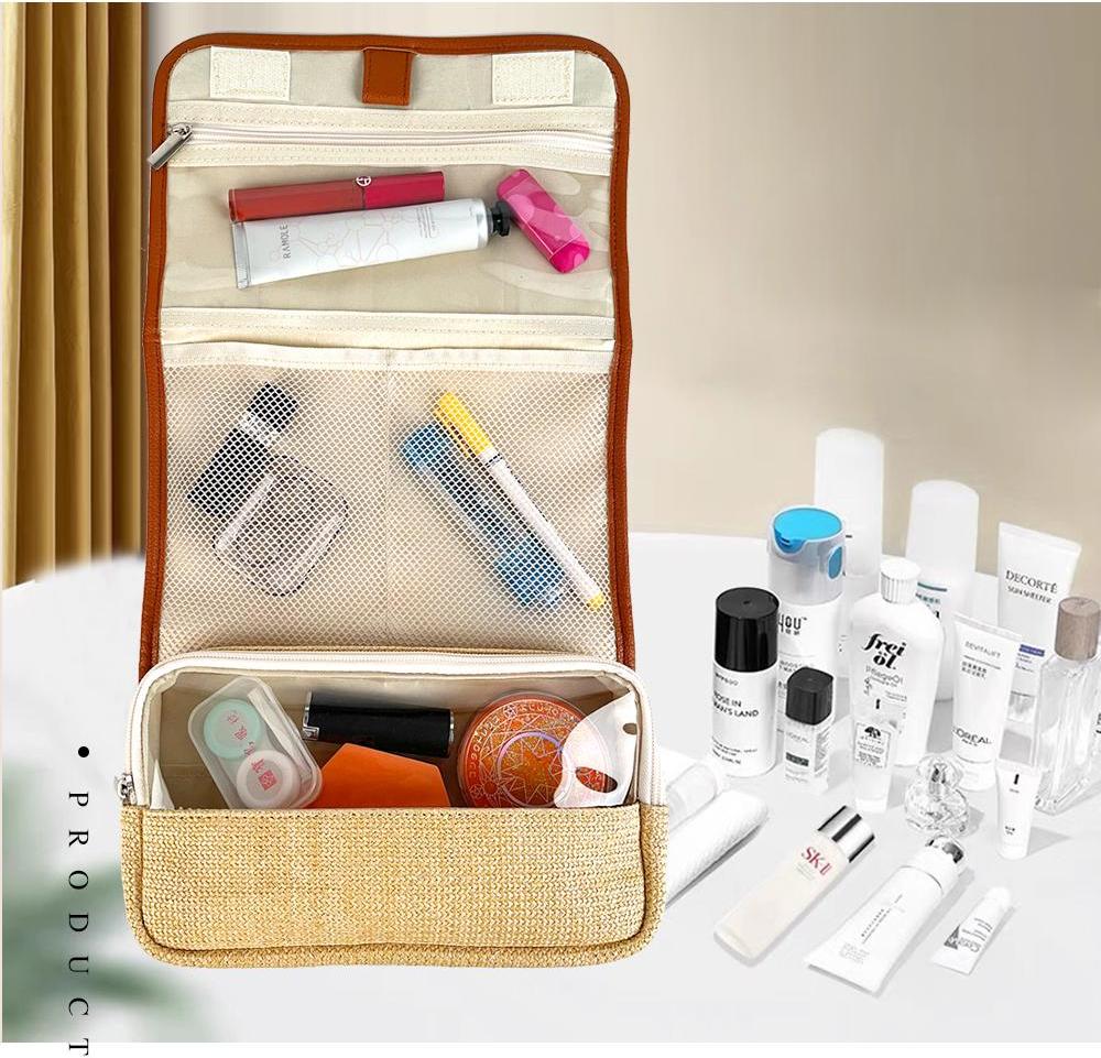 The Straw-Weave Cosmetic Bag combines rustic elegance with practical design. Crafted from natural straw-weave with a chic brown trim, it features multiple compartments, mesh pockets, and brush slots—ideal for storing makeup, skincare, and tools. Lightweight and portable with a convenient handle, it’s perfect for travel, daily use, or vanity organization. Available in two sizes to suit different storage needs, this bag offers both charm and functionality for modern lifestyles.